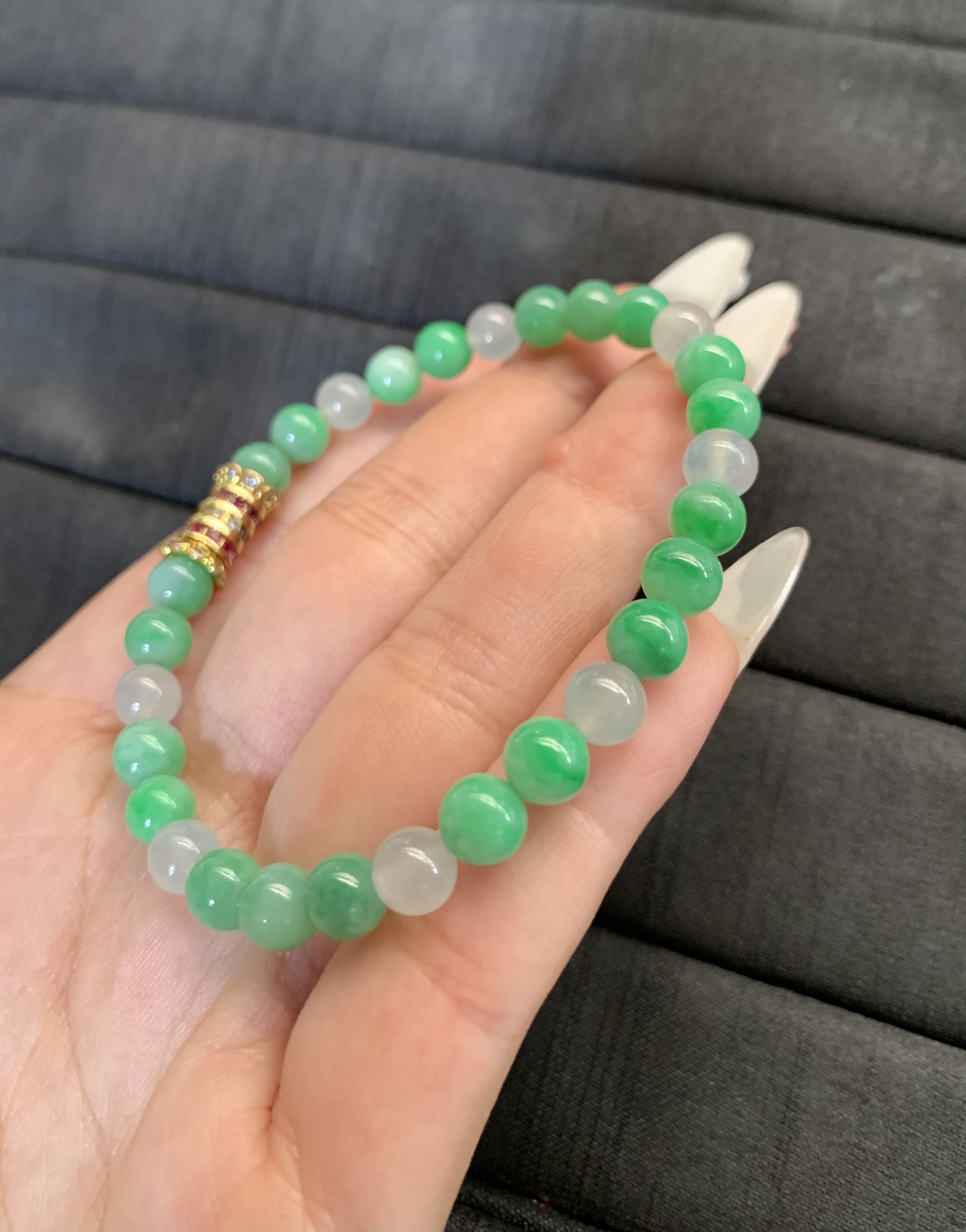This vibrant bracelet features a strand of round jade beads in a bright, fresh green hue, interspersed with clear icy white beads for a striking contrast. Each stone is meticulously polished to a smooth, glossy finish, showcasing excellent translucency and natural luster. A decorative gold-plated charm, intricately designed and accented with colorful details, serves as a beautiful focal point, adding a touch of elegance and cultural symbolism. The combination of vivid green jade and gold creates a look that is both lively and luxurious, making it a perfect accessory to bring joy and good fortune to any style.