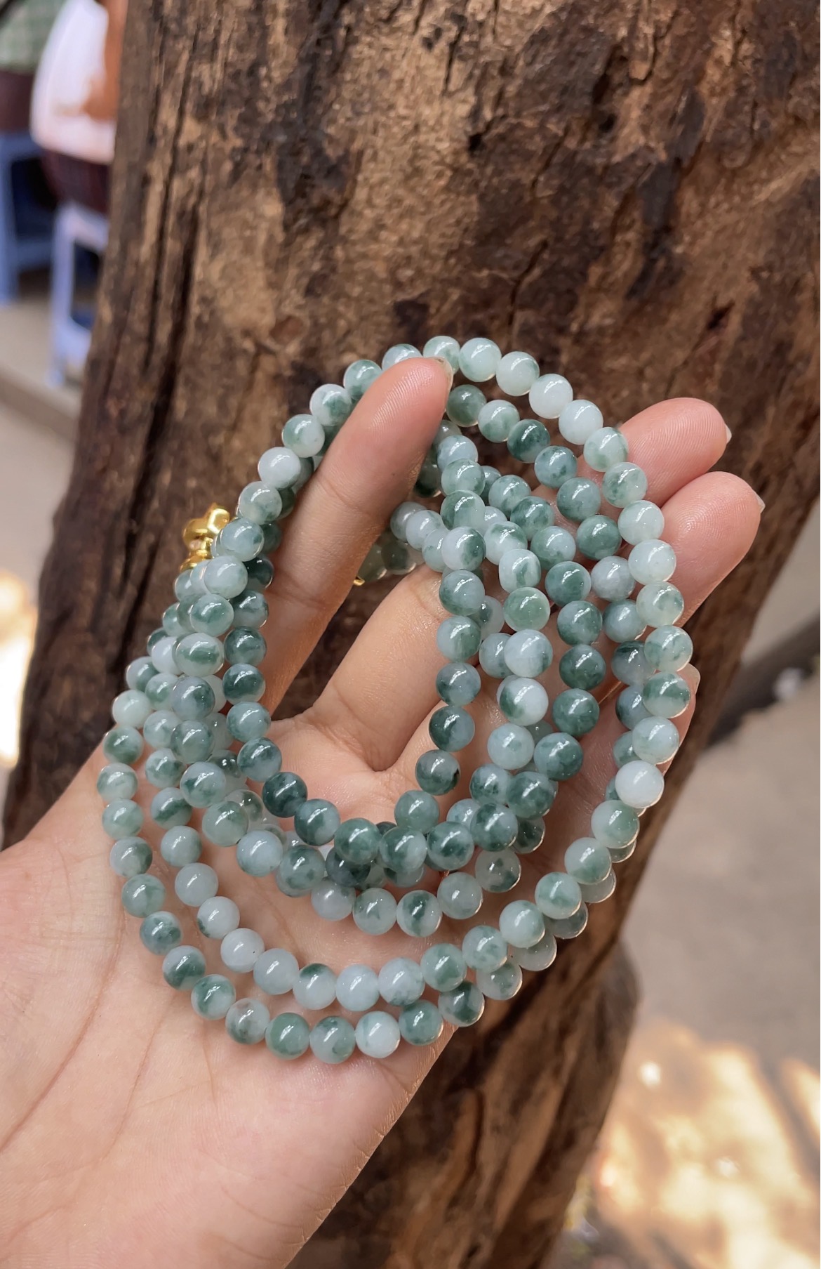 This elegant necklace features perfectly round natural jade beads in a beautiful green hue with unique natural mottling and textures. Each bead is smooth and polished to a glossy finish, showcasing excellent translucency and a luminous glow. The uniform size and shape create a sleek, refined look, while the ornate gold clasp adds a touch of classic luxury. Lightweight and versatile, it is perfect for layering or wearing alone, bringing a timeless sense of natural beauty and sophistication to any ensemble.