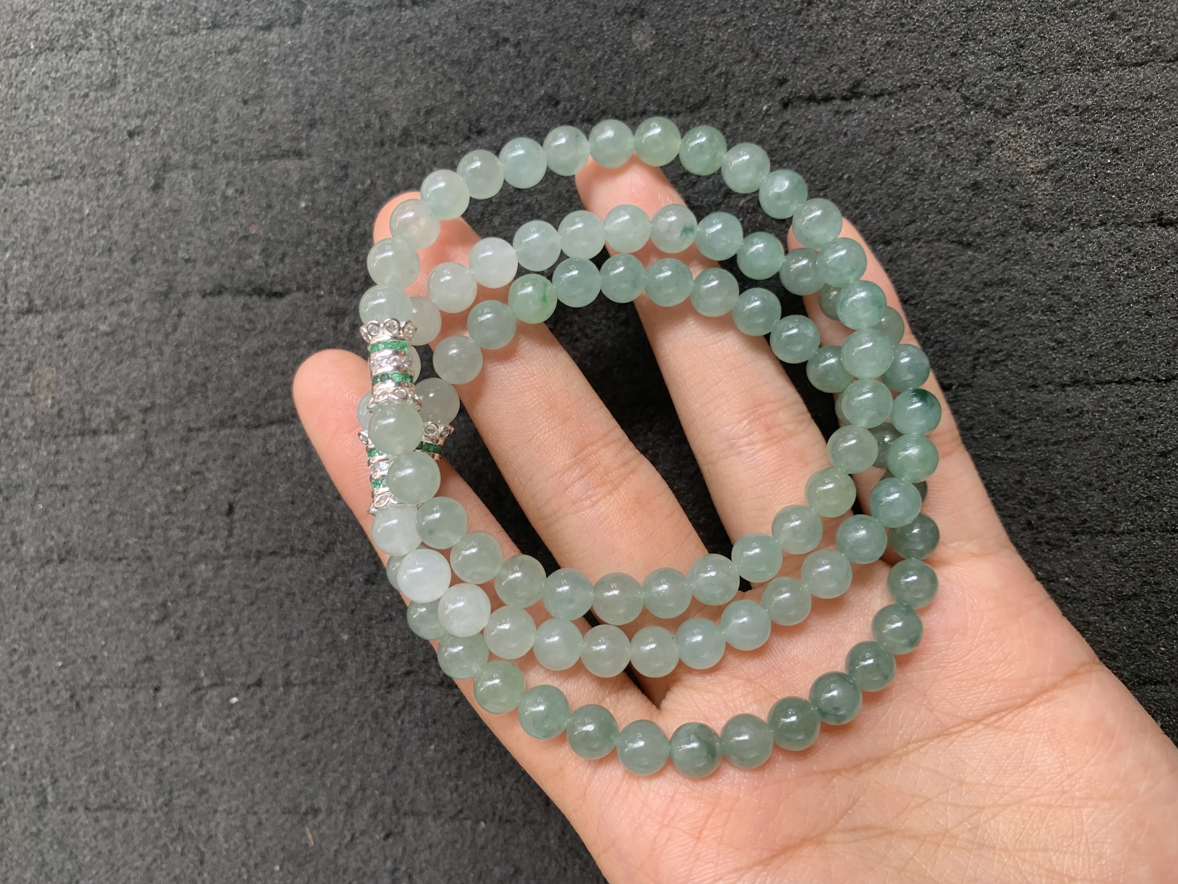 This delicate necklace features small, perfectly round jade beads in a cool, icy blue-green hue. The stones are highly translucent with a smooth, glass-like luster, exhibiting natural clarity and subtle color variations that add depth and character. Each bead is uniformly sized and polished, showcasing the fine texture and purity of the jade. The consistent tone and delicate size create a sleek and harmonious appearance. It is a versatile piece that can be worn as a single long necklace or wrapped multiple times as a bracelet, offering a classic and elegant style that highlights the serene beauty of the stone.