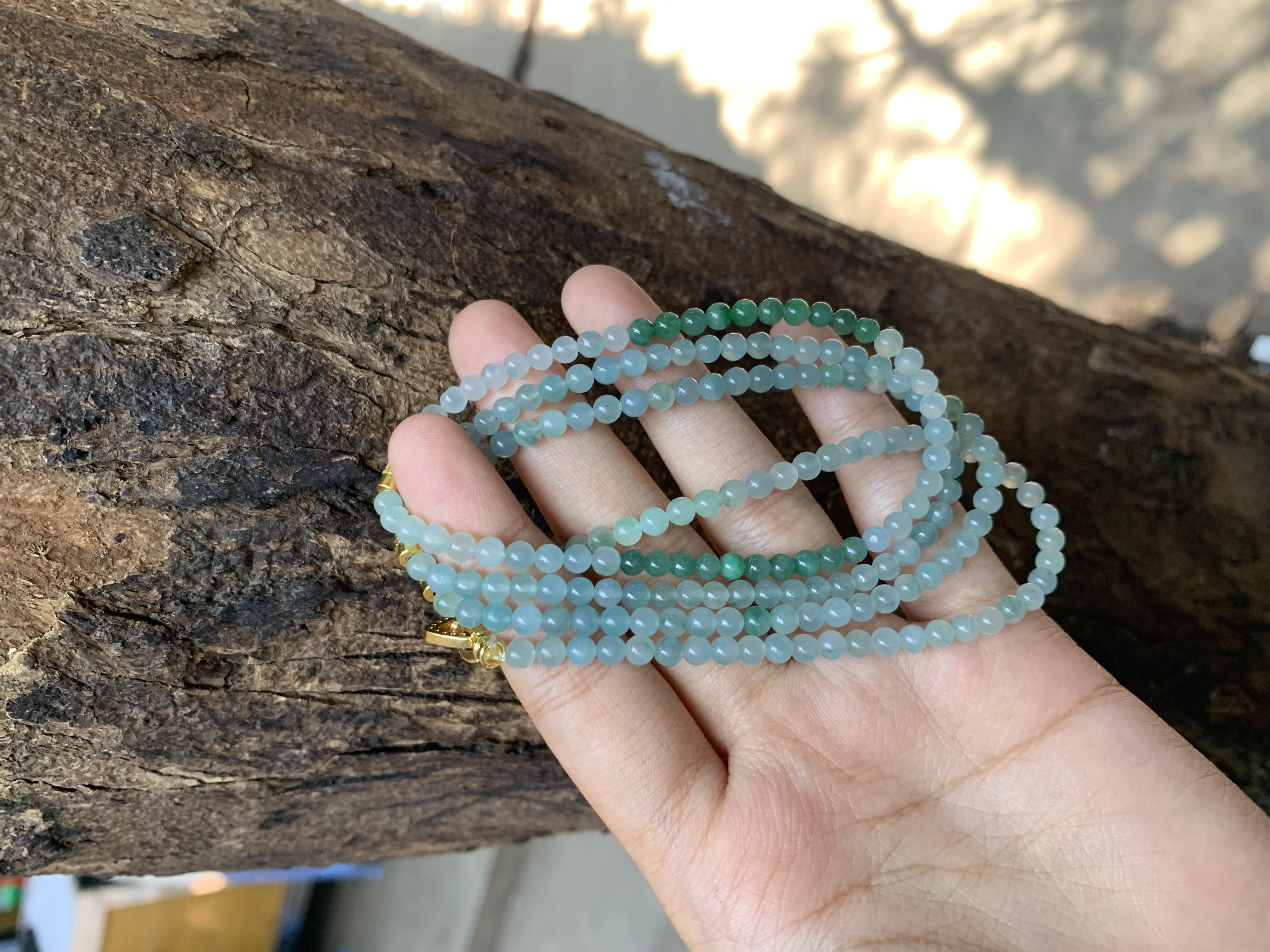This elegant necklace features small, perfectly round jade beads in a beautiful range of icy green tones, from pale and translucent to richer shades. The stones are highly polished with a smooth, glass-like surface that highlights their natural clarity and soft, glowing luster. They are strung together in a single long strand, creating a delicate and fluid design. The piece is finished with a simple yet sturdy gold-toned clasp that complements the cool color of the jade. The subtle color variations and fine craftsmanship make this necklace a timeless, versatile accessory that can be worn alone or layered for a more dramatic look.