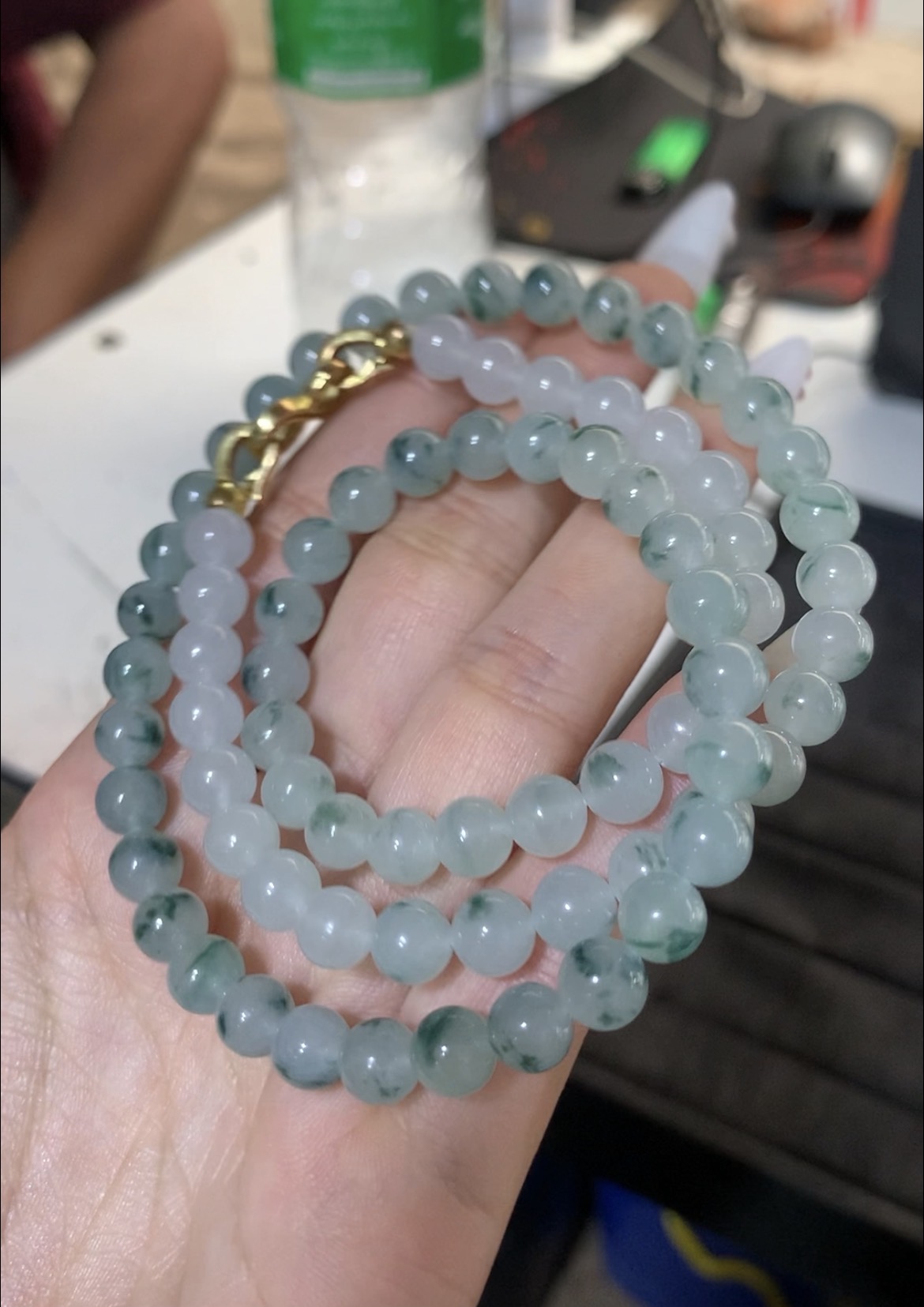 This elegant necklace is crafted from a long strand of round jade beads, featuring a beautiful icy base color adorned with natural floating green patterns. Each bead is carefully polished to a smooth, glossy finish, highlighting the stone's excellent translucency and delicate texture. The beads vary slightly in shade, creating a harmonious and organic look. It is finished with a refined gold clasp, which not only ensures secure fastening but also adds a touch of luxury. The versatile design allows it to be worn as a single long necklace, wrapped multiple times as a bracelet, or layered for different styles, making it a timeless accessory that embodies purity and the natural beauty of jade.