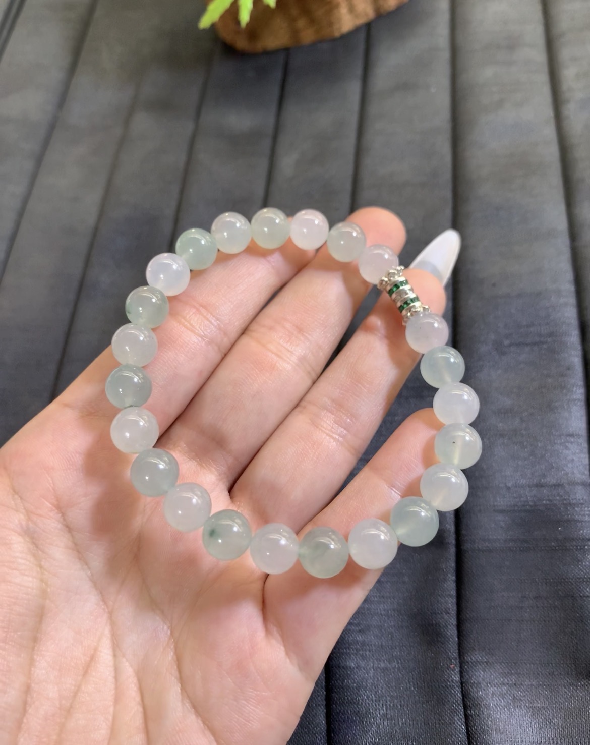 This elegant bracelet features perfectly round natural jade beads in a soft icy green hue. The stones are highly translucent with a smooth, glossy finish, allowing light to pass through and create a gentle, luminous glow. Each bead showcases natural clarity and subtle internal textures, highlighting the authentic quality of the stone. A decorative silver spacer, intricately designed and accented with tiny green stones, adds a subtle touch of color and intricate detail. Strung together for a comfortable fit, this piece is a sophisticated and calming accessory that brings a sense of pure elegance to your style.