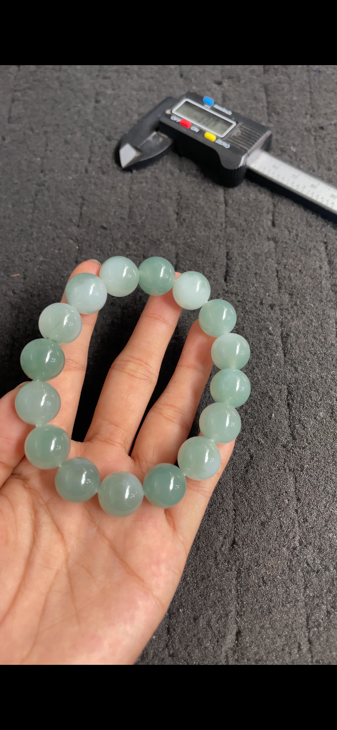 This elegant bracelet features large, perfectly round natural jade beads in a soothing icy green hue. Each bead is smooth and polished to a high-gloss finish, showcasing excellent translucency and a luminous glow that resembles clear water. The substantial size and uniform shape create a bold yet refined look, highlighting the natural beauty and quality of the jade. A timeless and sophisticated accessory that brings a sense of calm and natural charm to any outfit.