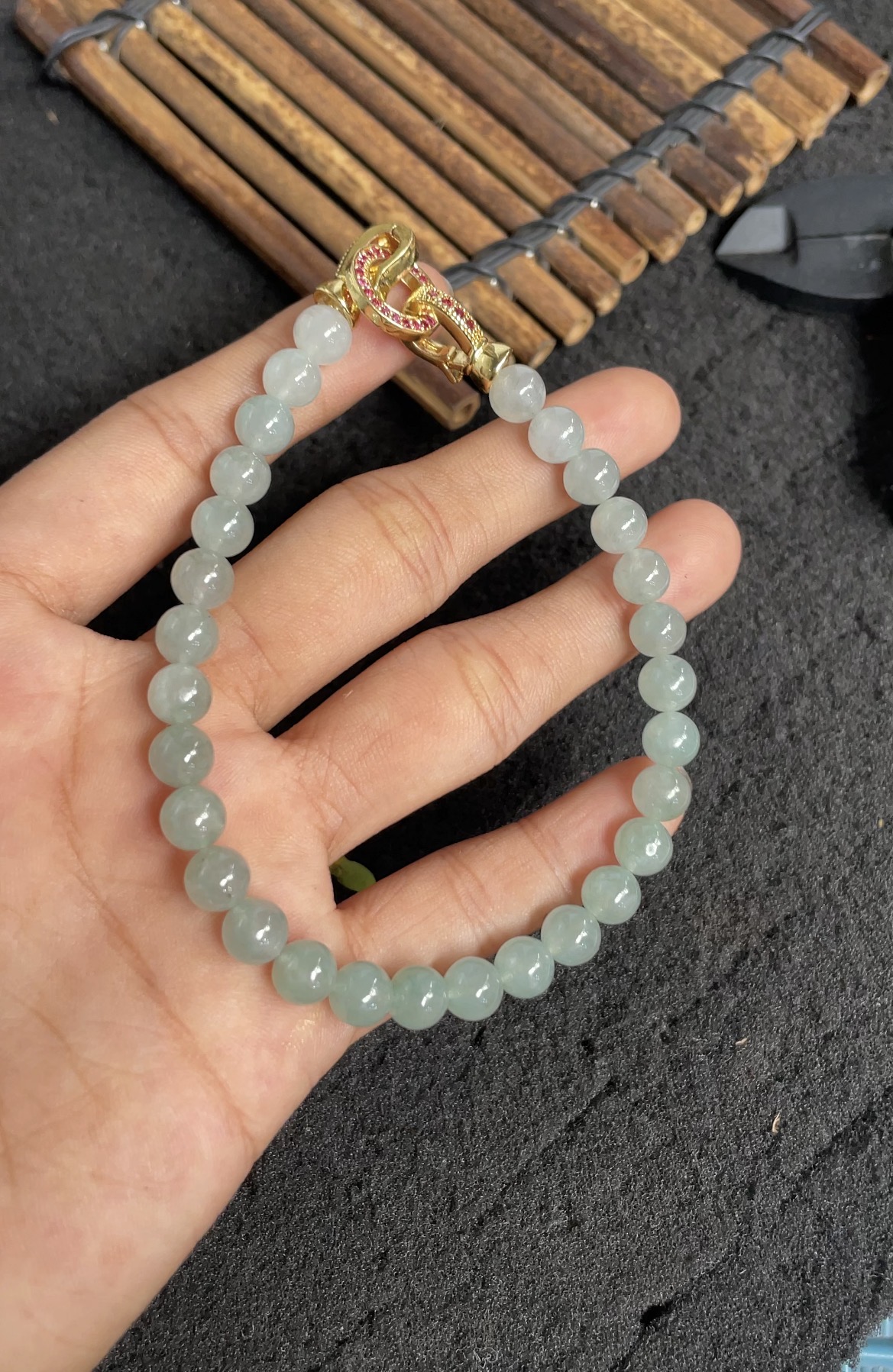 This elegant bracelet features perfectly round natural jadeite beads in a soft icy green tone, polished to a smooth, glossy finish that highlights its excellent translucency and luminous appearance. The design is finished with an ornate gold-toned clasp adorned with sparkling pink gemstones, adding a luxurious touch of color and brilliance. Simple yet sophisticated, this piece showcases the natural beauty of jadeite, making it a timeless and refined accessory for any occasion.