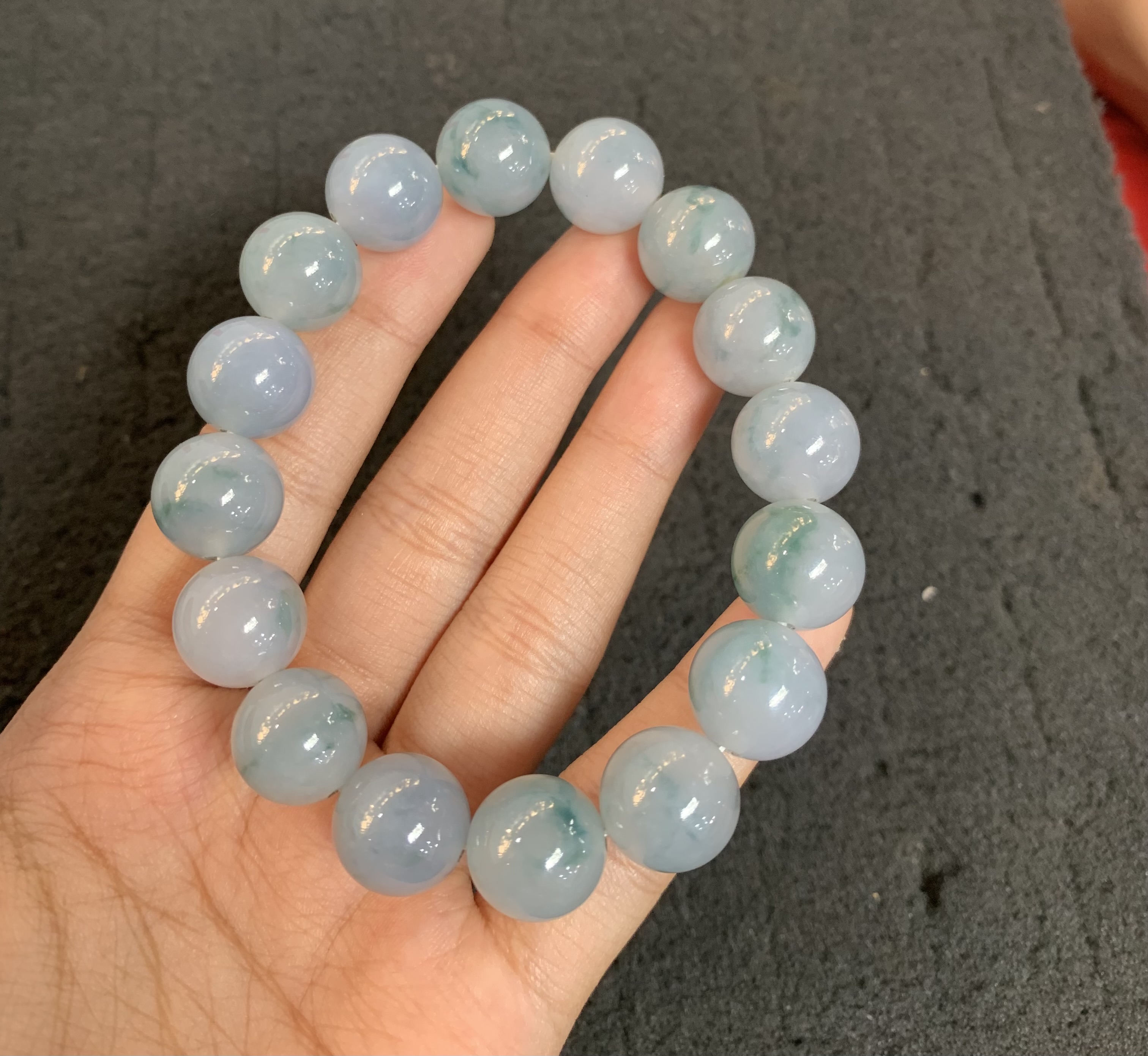This elegant bracelet is crafted from premium jadeite beads, showcasing a delicate icy lavender base with subtle natural green patterns scattered throughout. Each round bead is polished to a smooth, glossy finish, highlighting the stone's translucent texture and unique internal veining. Known for its cultural significance, jadeite is believed to bring balance, prosperity, and positive energy to the wearer. The generous bead size ensures a substantial yet comfortable fit, making it a sophisticated accessory for both casual and formal occasions. Every piece is one-of-a-kind due to the inherent nature of the jadeite, giving it exclusive charm and collectible value.
