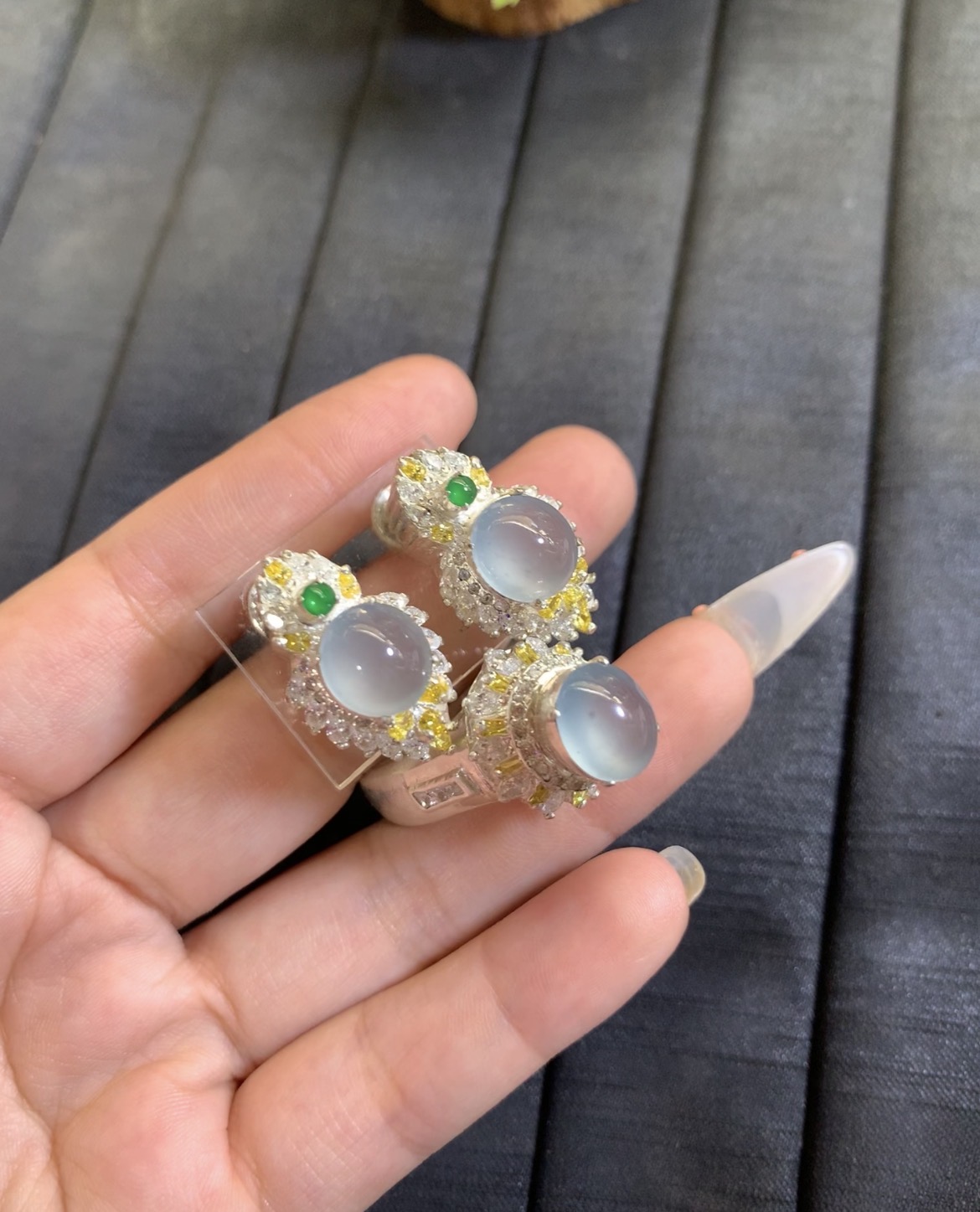 This stunning jewelry set features a matching ring and pair of earrings, each centered with a large, round cabochon of natural icy white jade. The stones are highly translucent with a smooth, glossy surface, allowing light to pass through and create a soft, luminous glow that resembles clear water. Each piece is beautifully accented with a small vibrant green jade stone and sparkling yellow and clear stones, set in intricate silver work. The detailed design enhances the pure beauty of the jade, creating a luxurious and eye-catching look that is both elegant and timeless.
