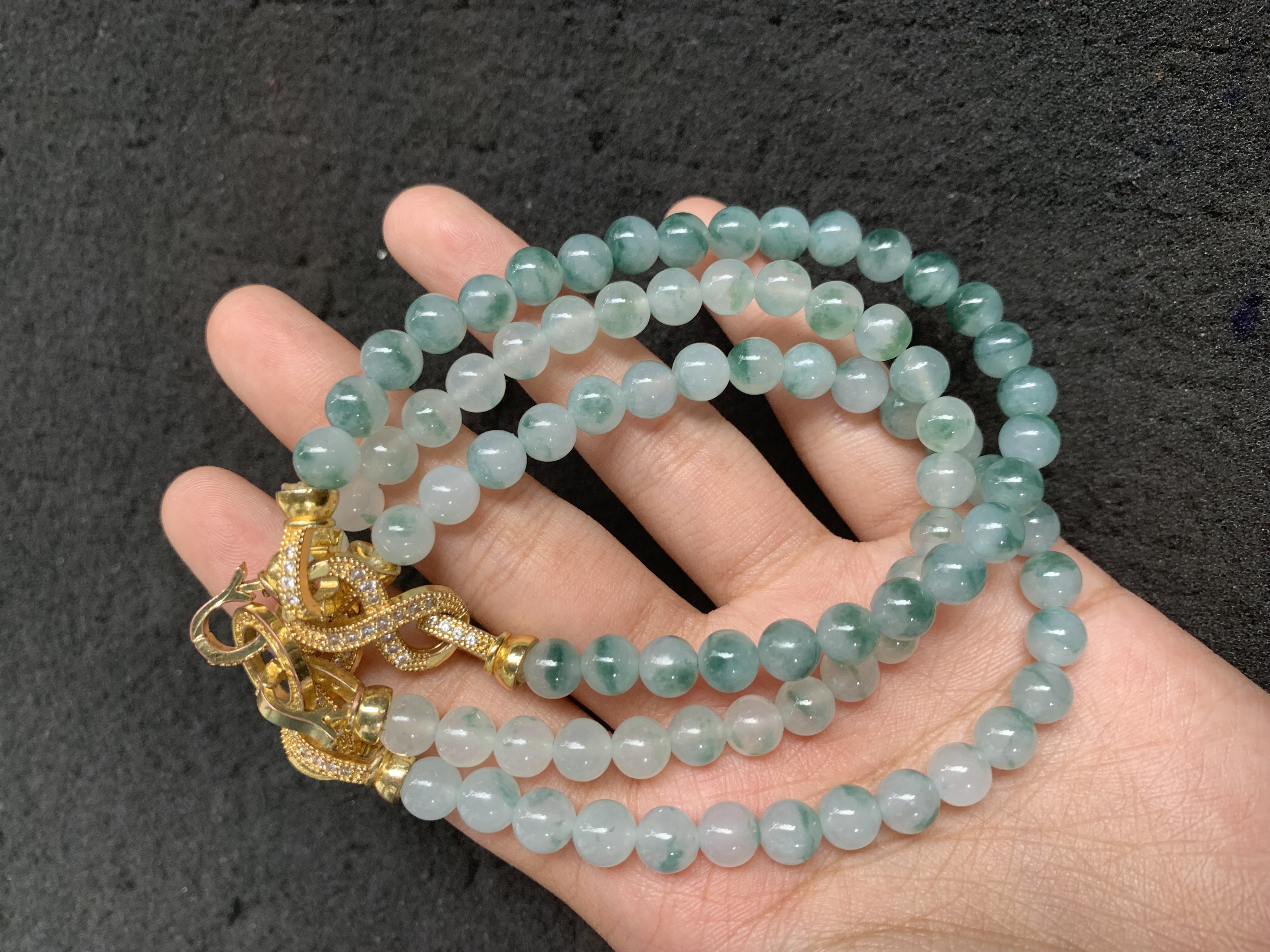 This elegant necklace features round jadeite beads with delicate green floating patterns, showcasing a translucent texture. Adorned with a polished gold-toned clasp, it combines traditional gemstone beauty with refined craftsmanship, making it a perfect accessory for both daily wear and special occasions