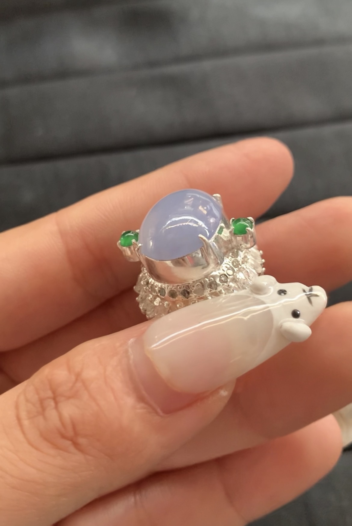 This striking ring features a large, oval cabochon of natural lavender jade, celebrated for its soft, pastel purple hue and smooth, glossy surface. The main stone is elegantly framed by a textured sterling silver setting adorned with sparkling details, complemented by two small, vivid green accent stones that create a beautiful color contrast. The intricate design of the band adds a touch of modern artistry and luxury. A bold and eye-catching piece that showcases the unique beauty of lavender jade, perfect for making a sophisticated statement.