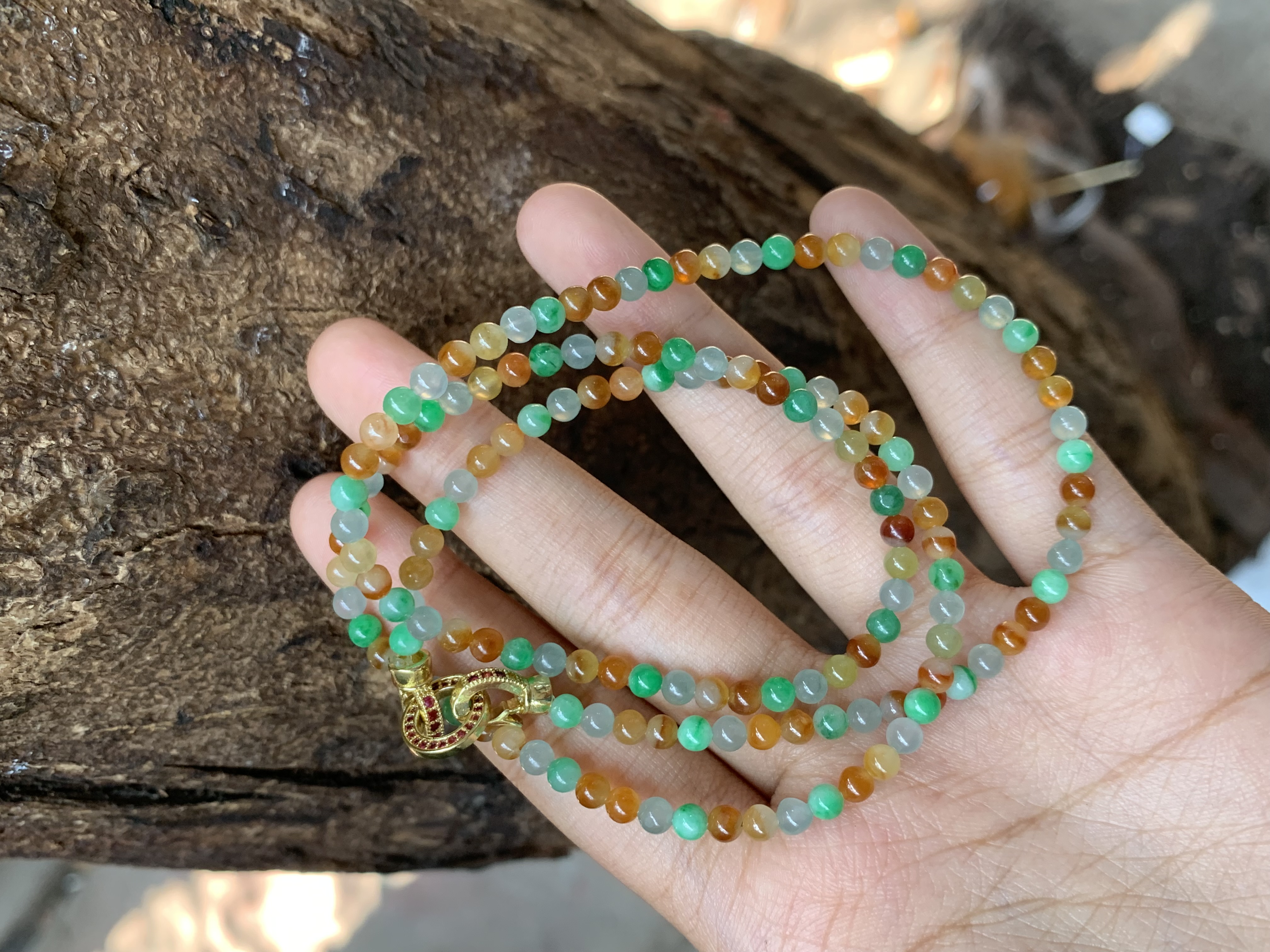 This beautiful necklace features tiny, perfectly round jade beads in a stunning variety of natural colors, including vibrant green, warm yellow, honey brown, and icy clear. The stones are highly polished with a smooth, glossy finish that enhances their translucency and natural luster. They are strung together in a single strand, creating a harmonious rainbow effect. The piece is finished with an ornate gold-toned clasp accented with small red details, adding a touch of luxury. The delicate size and rich color palette make this necklace lightweight, versatile, and perfect for wearing alone or layering.