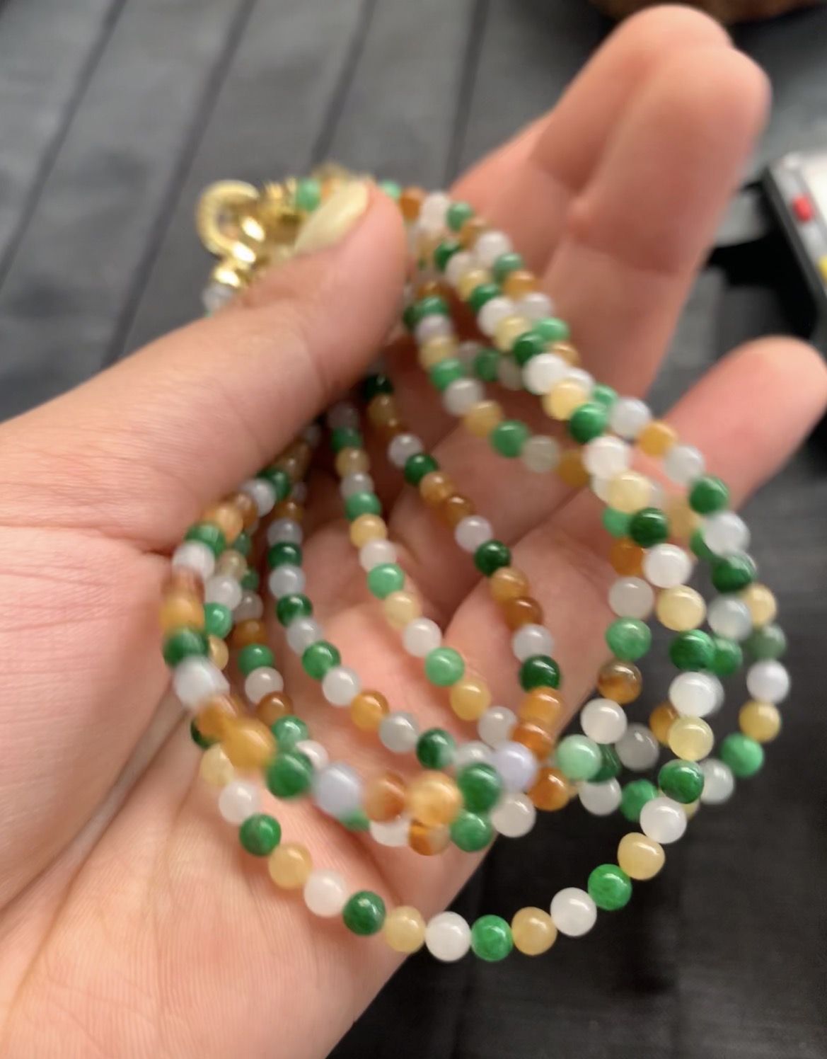 This vibrant necklace features tiny, perfectly round natural jadeite beads in a beautiful array of colors, including deep green, fresh green, warm yellow, orange, and icy white. Each bead is polished to a smooth, glossy finish, highlighting its natural translucency and unique texture. The beads are strung together in multiple strands and finished with an ornate gold-toned clasp adorned with colorful gemstones, creating a luxurious and eye-catching design. The harmonious blend of colors and intricate details make this piece a stunning accessory that brings natural beauty and sophistication to any look.