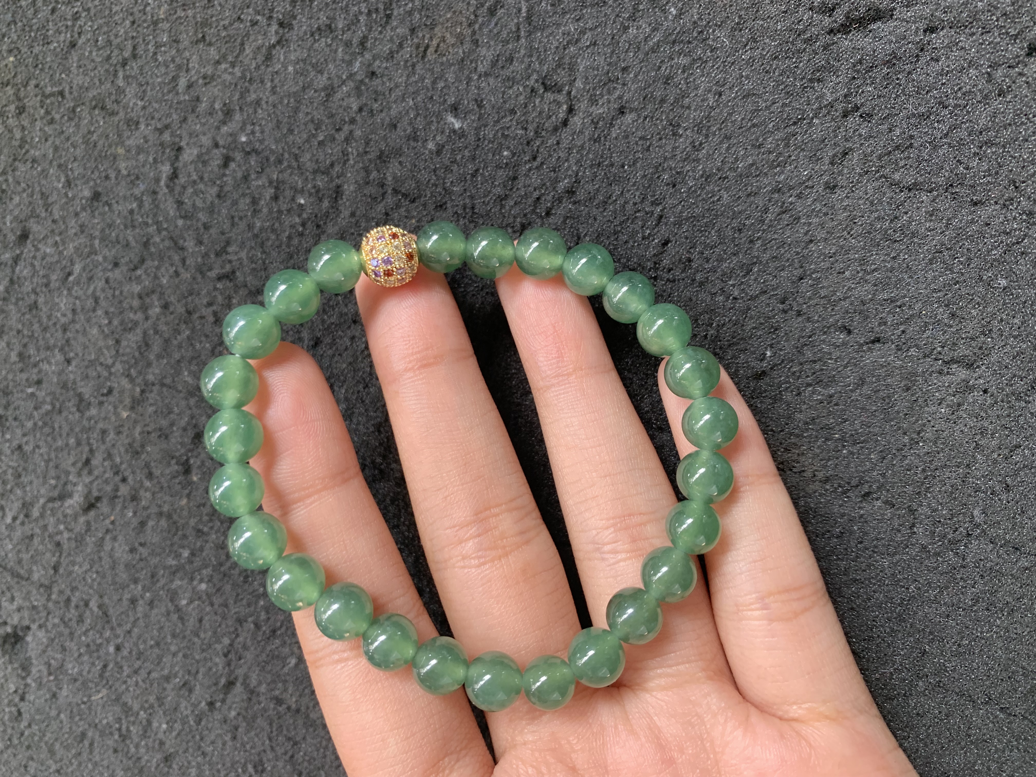This exquisite bracelet features perfectly round jade beads in a sophisticated "oil green" color. The stones possess a deep, rich green hue with excellent translucency and a smooth, waxy luster that gives them a soft, glowing appearance. Each bead is meticulously polished to a flawless surface, highlighting the fine texture and natural beauty of the jade. The bracelet is strung together in a single strand and is accented with a decorative gold bead intricately set with colorful gemstones, adding a touch of luxury and detail. The design is elegant and understated, making it a timeless accessory that complements any style.