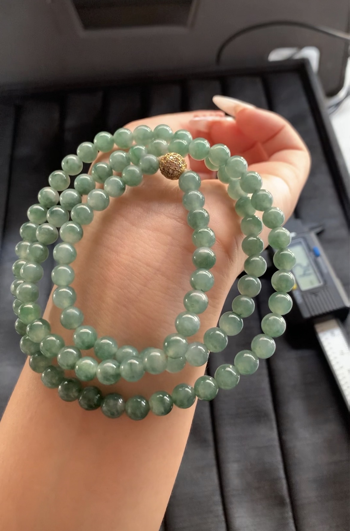 This elegant necklace features perfectly round jade beads in a rich oil green hue. The stones are highly polished to a smooth, glossy finish, showcasing excellent translucency and a subtle natural luster. The color is deep and consistent, with fine texture that adds a sense of natural quality. The strand is accented with a decorative gold-toned bead encrusted with small clear stones, adding a touch of luxury and contrast. It is a versatile piece that can be worn as a single long necklace or wrapped multiple times as a bracelet, offering a classic and sophisticated style.