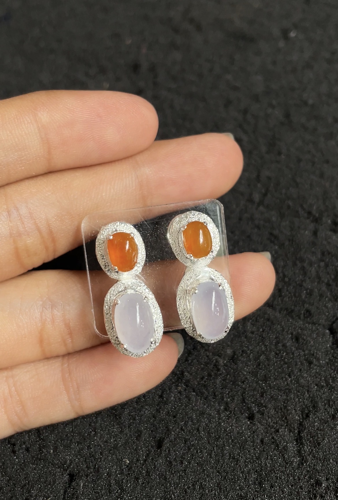 These elegant earrings feature a beautiful combination of natural jade stones in warm orange and soft lavender hues. Each piece showcases two smooth oval cabochons—one vibrant orange and one delicate lavender—carefully set in intricate silver work surrounded by a halo of sparkling clear stones. The stones exhibit excellent translucency and a glossy finish that radiates a gentle glow. The unique design creates a striking contrast of warm and cool colors, making it a sophisticated and eye-catching accessory.