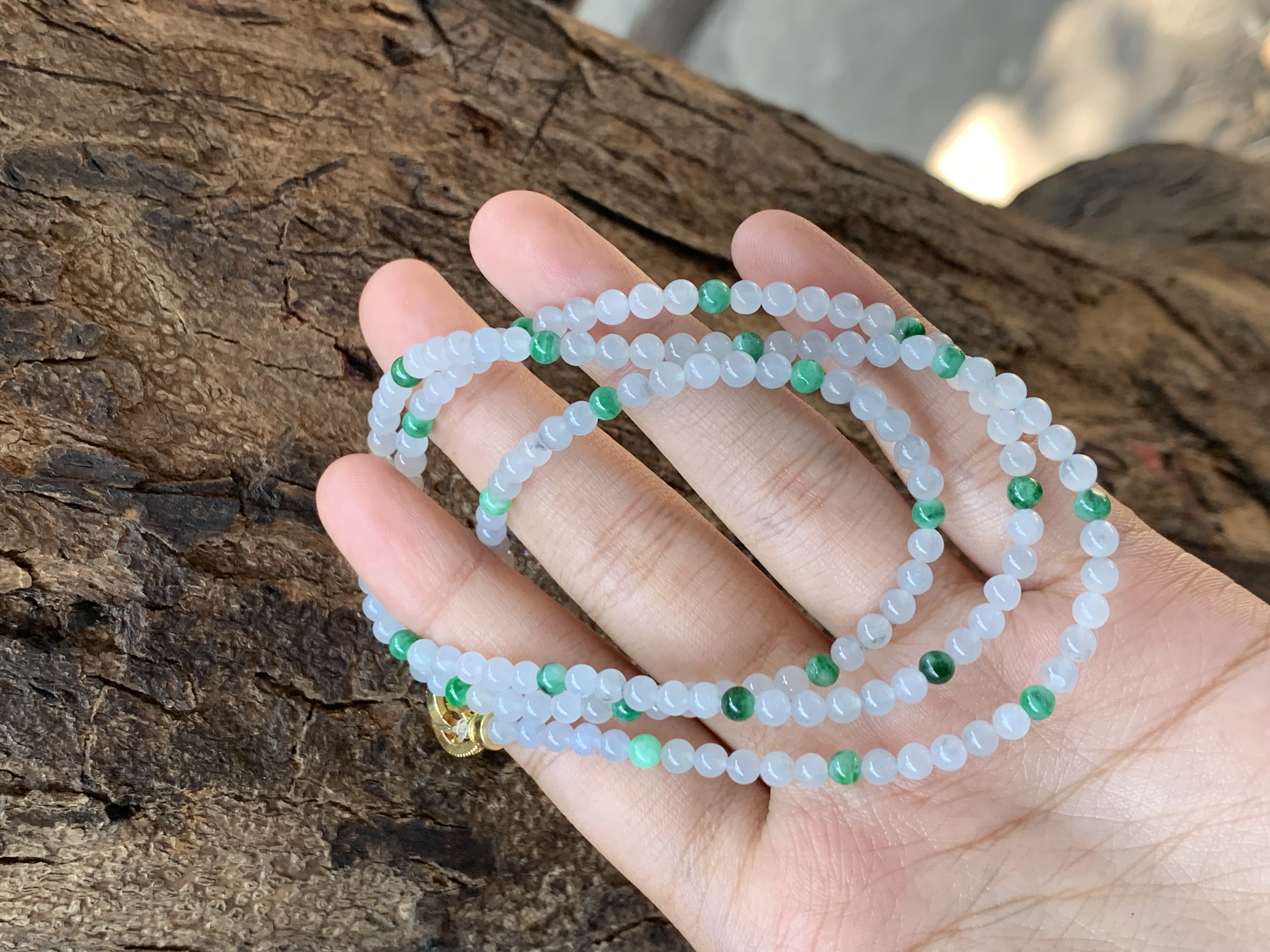 This delicate necklace features a beautiful combination of small, round natural jade beads. The majority are luminous white jade with a smooth, glossy finish, interspersed with vibrant green jade beads that create a striking contrast and add a touch of nature's color. Strung together in an elegant design and finished with a polished gold clasp, this piece is lightweight, versatile, and perfect for adding a subtle yet sophisticated touch to any outfit. A timeless accessory that celebrates the natural beauty of jade.
