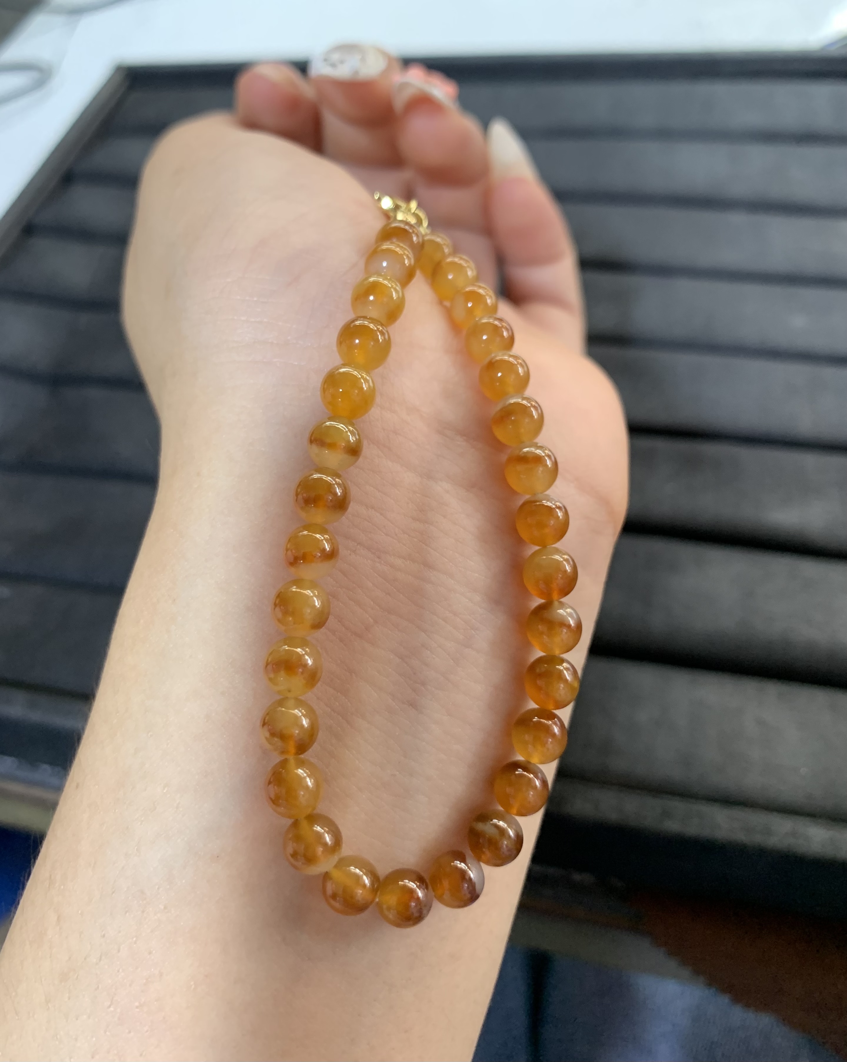 This exquisite necklace features a strand of smooth, round yellow jade beads, showcasing a warm, honey-like hue with natural translucency. Each bead is carefully polished to a glossy finish, highlighting the stone's natural texture and subtle color variations. The uniform size and consistent quality of the beads create an elegant, timeless design that can be worn as a single strand or layered for a more versatile look. Perfect for adding a touch of natural beauty and sophistication to any outfit, this piece is a classic addition to any jewelry collection.