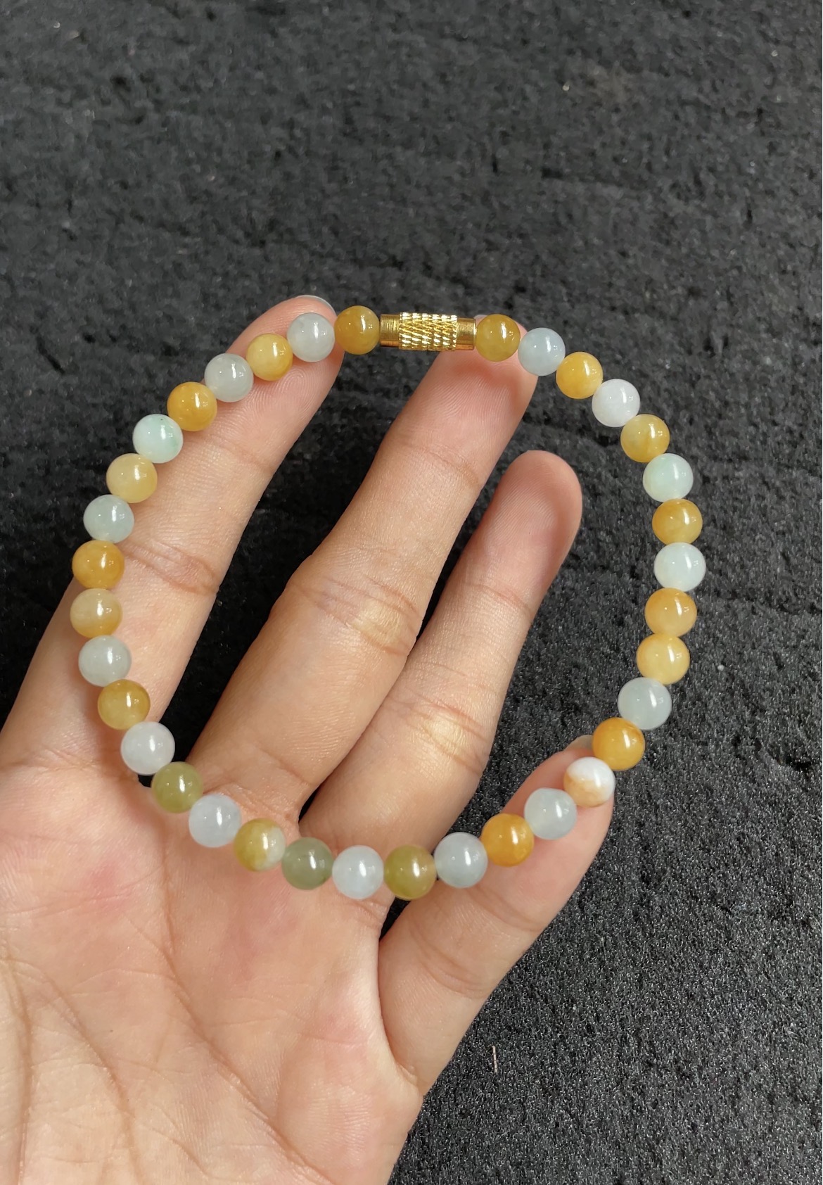 This elegant bracelet features a harmonious blend of natural jade beads in warm honey yellow and pure icy white tones. Each bead is perfectly round, smooth, and polished to a glossy finish, showcasing excellent translucency and unique natural textures that add depth and character. The combination of warm and cool hues creates a balanced and sophisticated look, while the decorative gold spacer adds a touch of classic luxury. Lightweight and comfortable to wear, it is perfect for adding a subtle pop of natural color and timeless charm to any outfit.