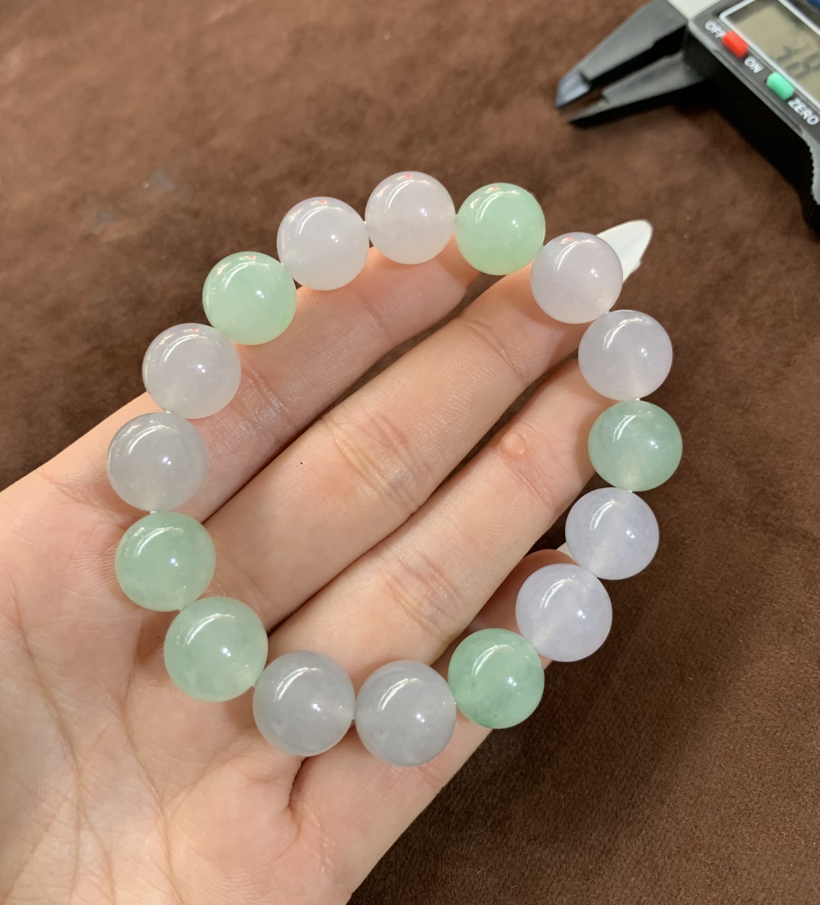 This charming stretch bracelet features round, smooth jadeite beads in a lovely mix of soft pastel green and light lavender hues. Each bead has a polished finish with good translucency, highlighting subtle natural variations that add unique character. Designed with a stretch cord for easy and comfortable wear, it blends classic jadeite beauty with a fresh, playful look – ideal for brightening up daily outfits or complementing special occasion ensembles.