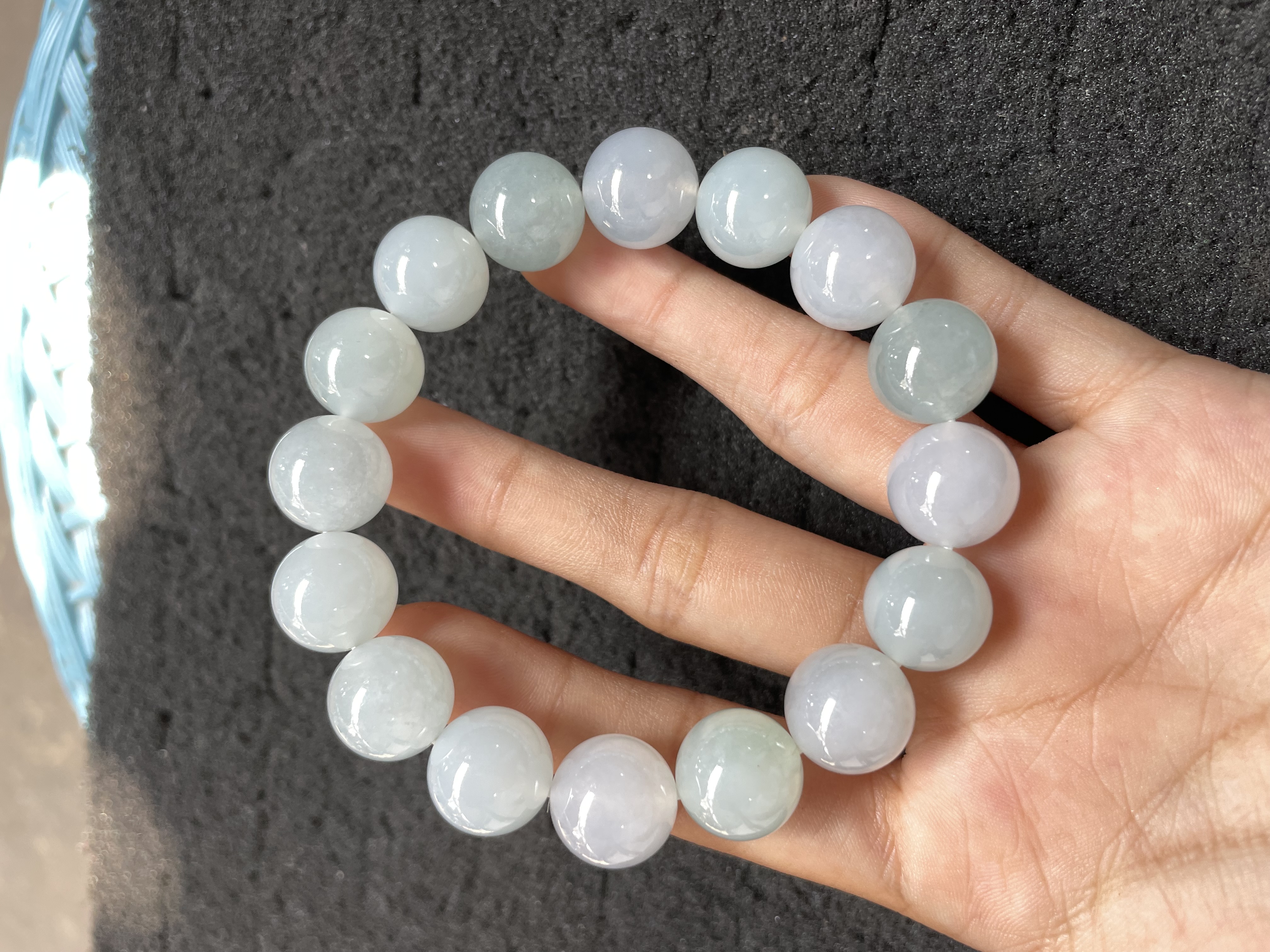 This elegant stretch bracelet features round jadeite beads with soft pastel hues of lavender, light green, and white, each with a smooth, translucent finish. The natural color variations give it a unique charm, making it a perfect accessory for daily wear or as a subtle addition to any jewelry collection.