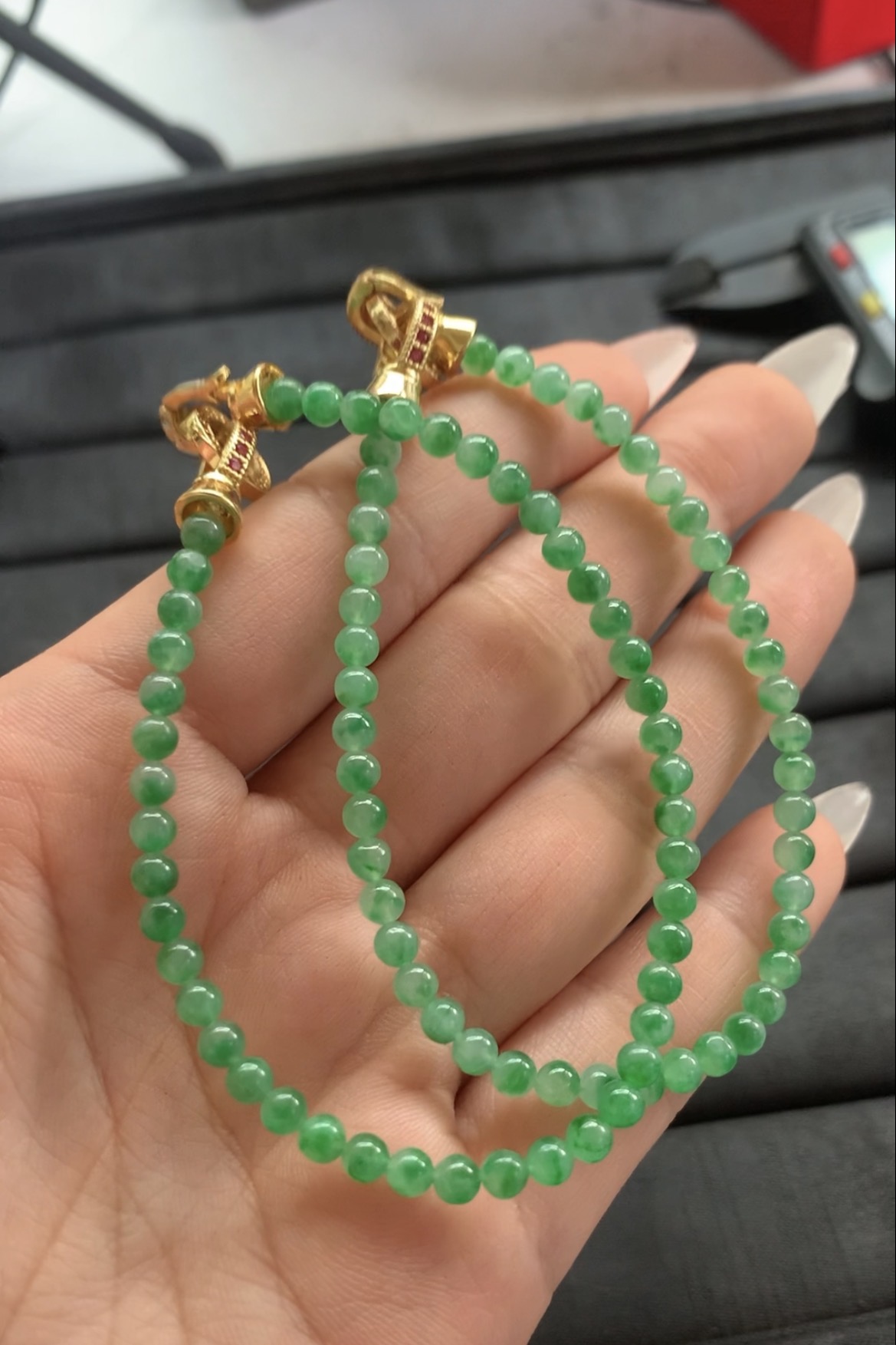 These exquisite bracelets feature small, round green jade beads in a deep, vivid hue, polished to a smooth sheen that accentuates the stone's natural beauty. Each piece is finished with a decorative gold-toned clasp adorned with subtle red accents, adding a touch of luxury and detail. Designed as stretch or clasp-style bracelets, they offer comfortable wear and can be stacked together for a layered look or worn individually for understated elegance. Perfect for adding a pop of rich color to both casual and formal attire.