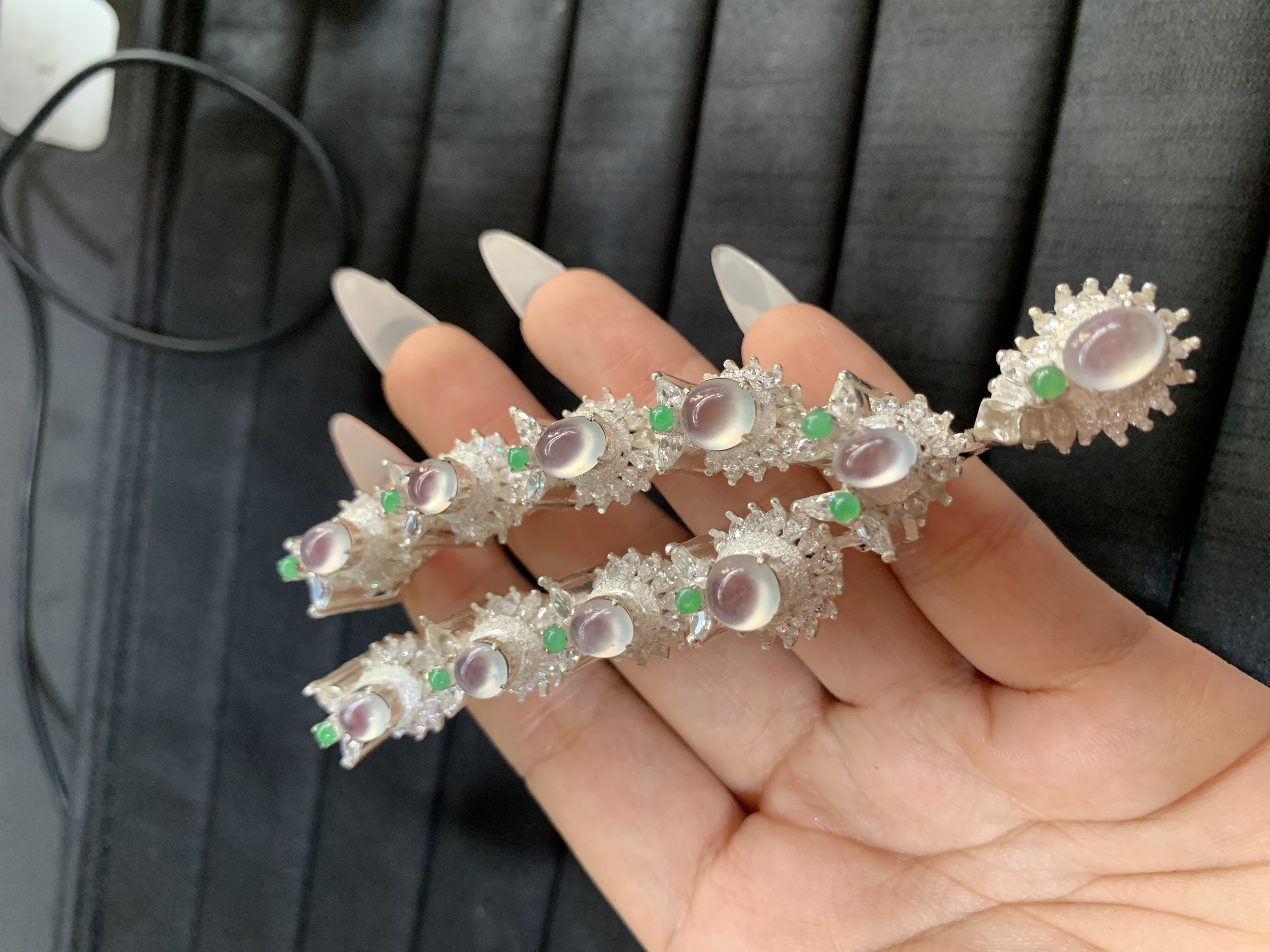 This collection features multiple intricately designed bracelets crafted in a textured silver-toned metal. Each piece showcases oval-shaped translucent gems with a subtle sheen, complemented by small round green accent gems. The unique, organic-style setting adds a touch of artistry, making these bracelets perfect for adding a bold yet elegant statement to both casual and formal ensembles, whether worn individually or stacked together.