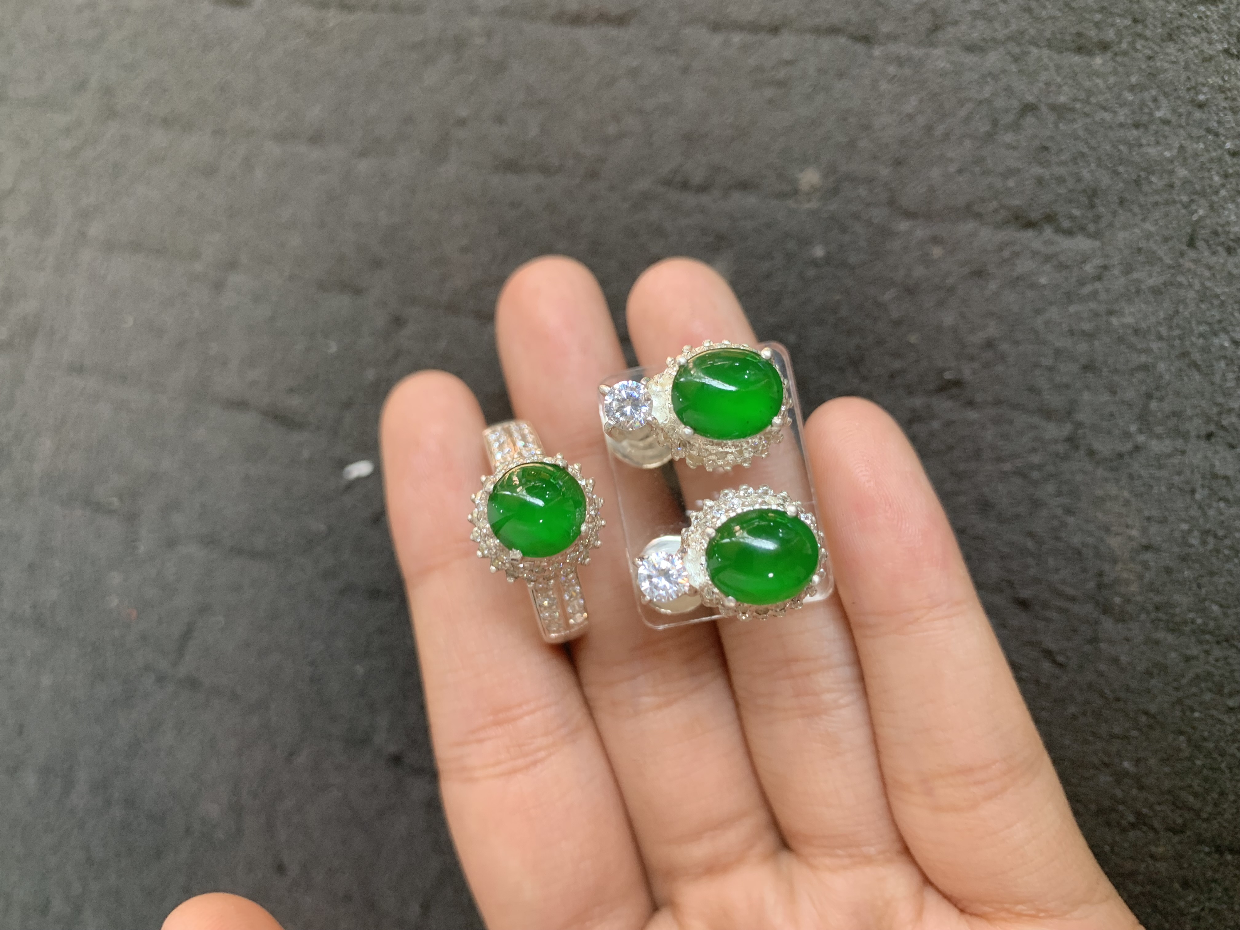 A hand holds a matching jewelry set consisting of a ring and a pair of earrings. Each piece features a glossy, bright green oval gemstone surrounded by a silver-toned metal frame with sparkling clear stone accents. The earrings are placed on a clear acrylic stand, and all items are displayed against a dark, matte background that enhances the gemstones' rich color and luster