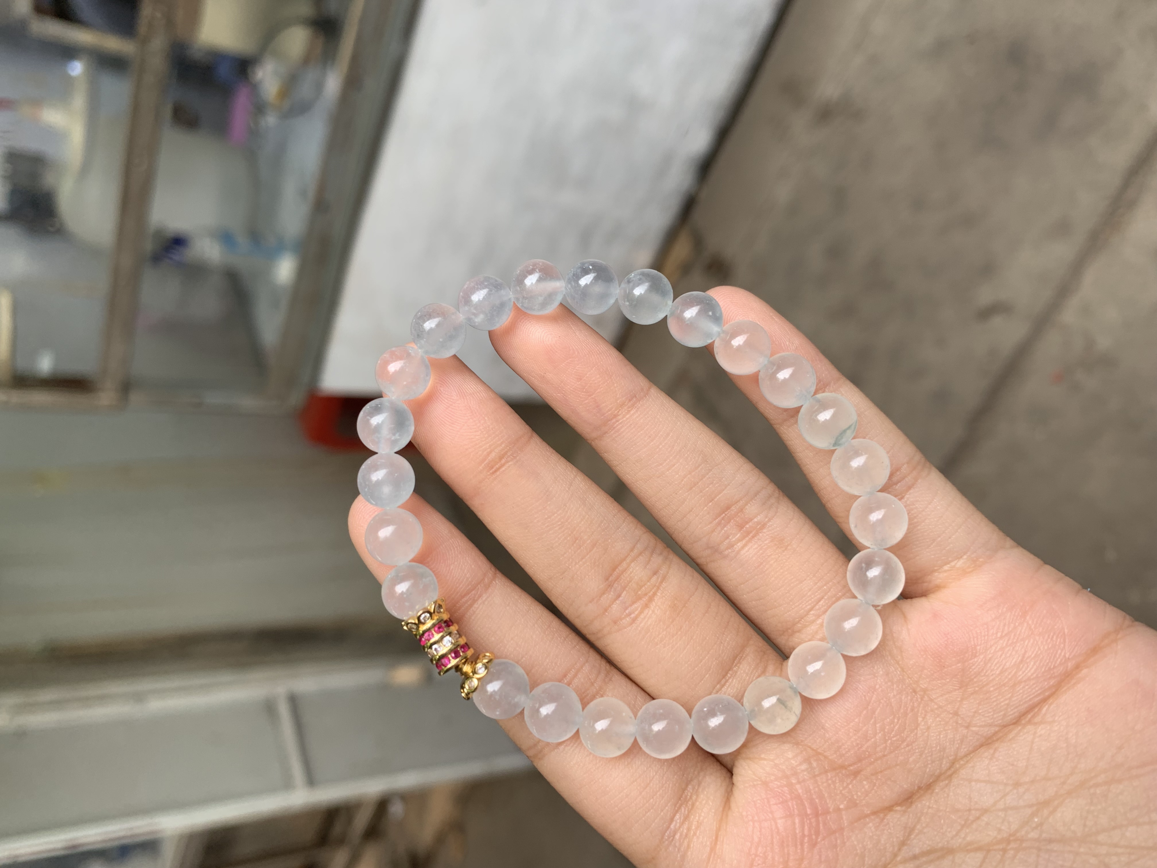 This delicate single-strand bracelet features smooth, round translucent clear jade beads with a subtle, icy appearance. It is adorned with an ornate gold-tone accent piece embedded with small colorful details, adding a touch of intricate charm to the minimalist design. The bracelet offers a light, elegant look suitable for both casual outings and refined gatherings.