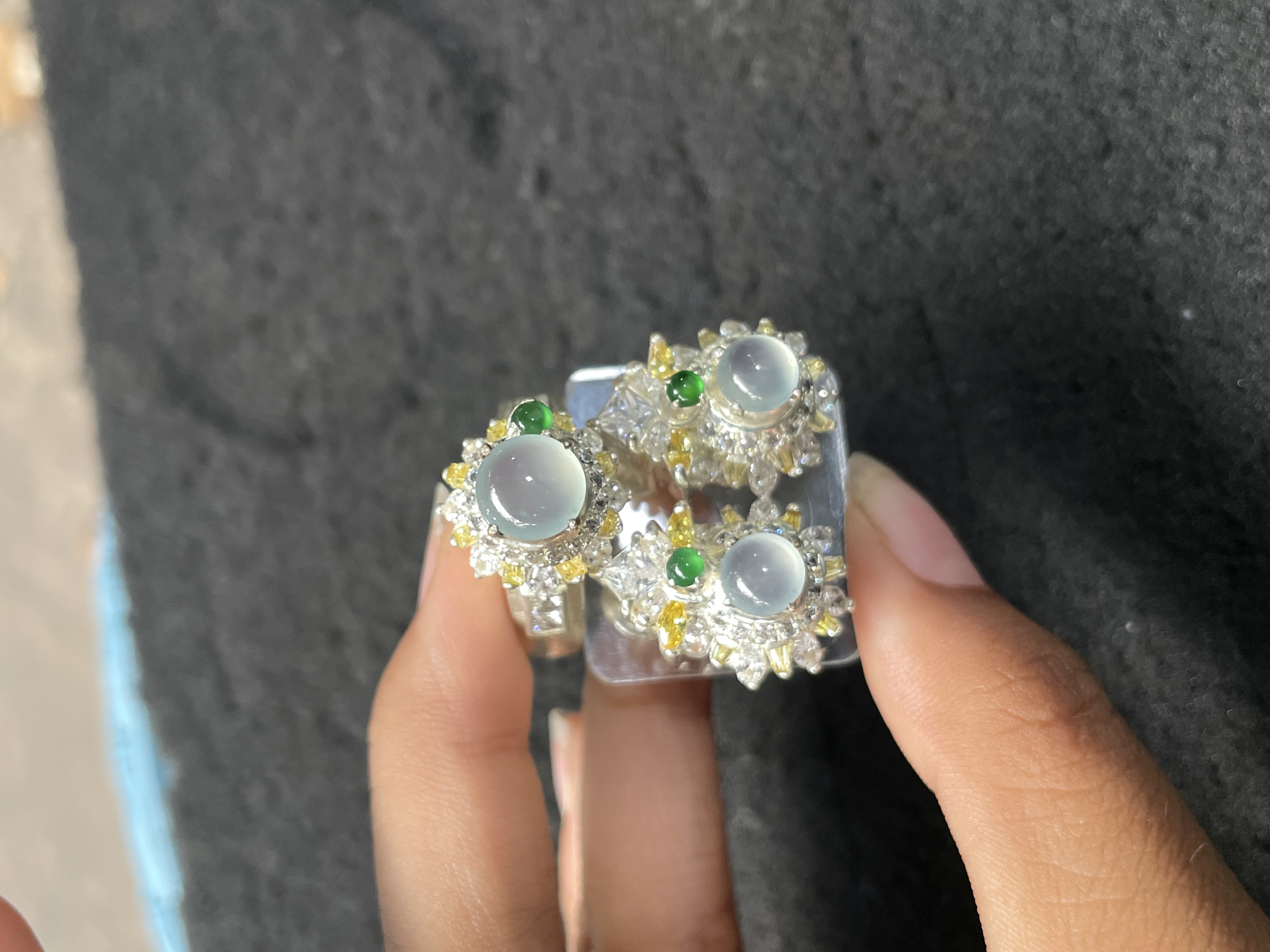 This elegant set includes a ring and a pair of earrings, each featuring a round translucent icy jade as the centerpiece. The pieces are adorned with small vivid green jade accents and mixed silver-tone and gold-tone decorative details, creating a luxurious and intricate design. Perfect for adding a touch of sophisticated glamour to special occasions or as a high-end collection piece.