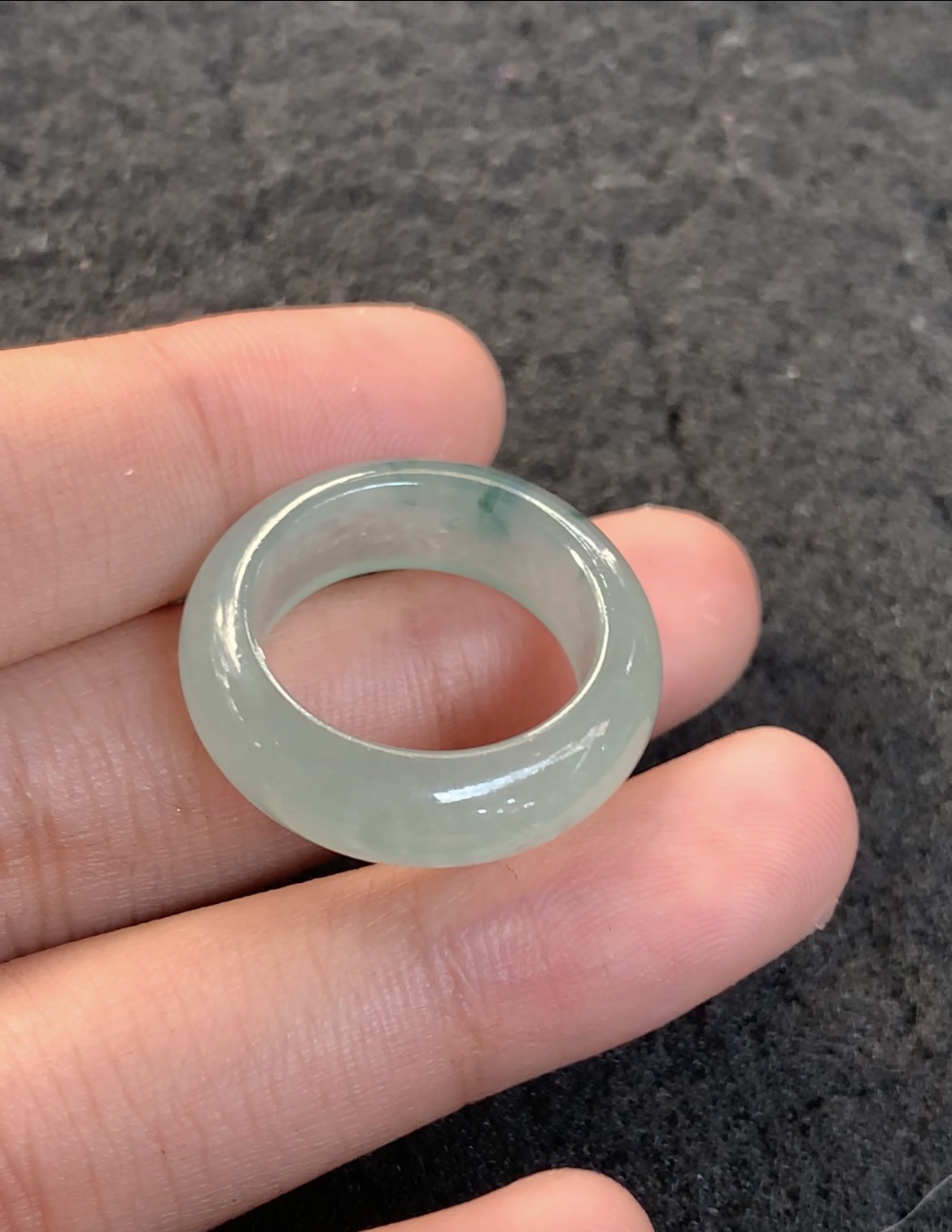 A smooth, polished jadeite ring featuring a delicate light green hue with subtle translucent quality and natural bluish-green flecks. Held in hand to showcase its elegant, simple design and fine texture.