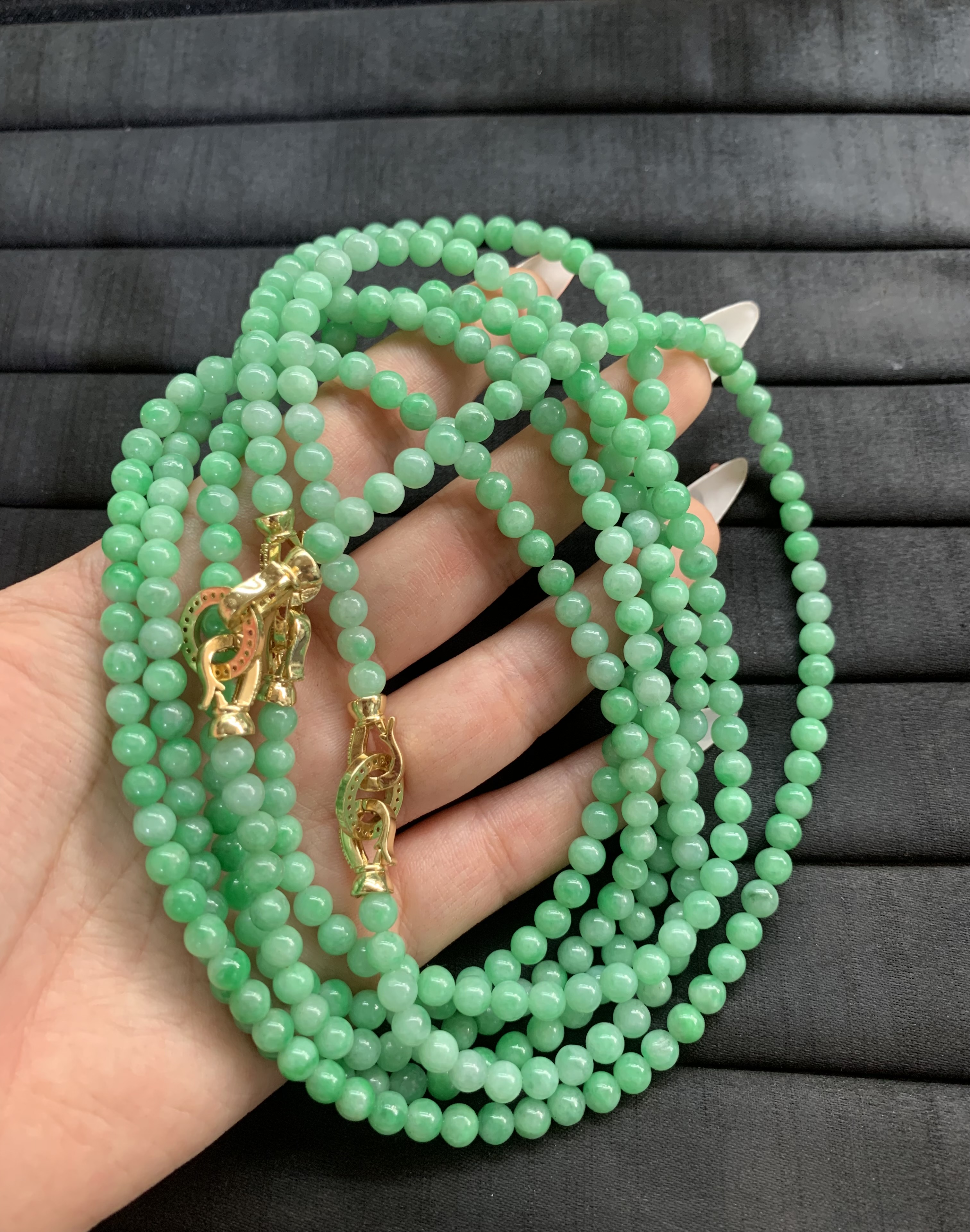 Rich Green Jade Bead Bracelets with Embellished Gold-Toned Clasps