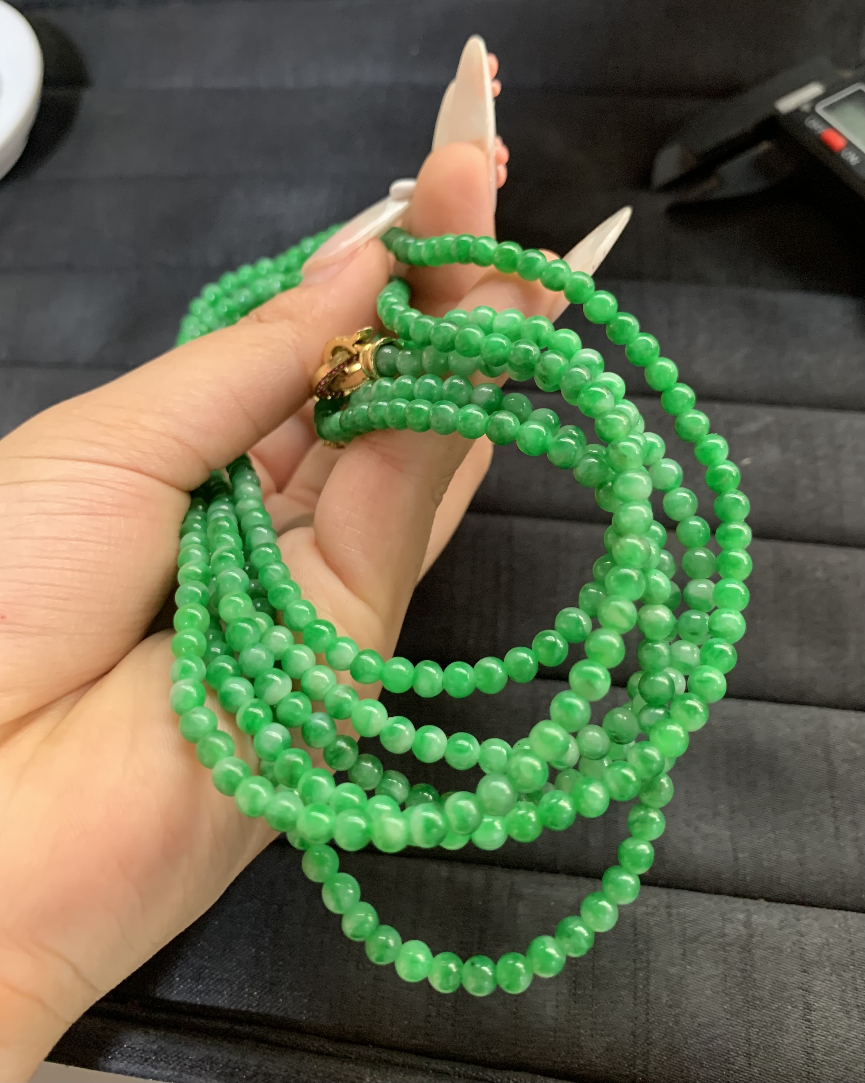 This eye-catching necklace features multiple strands of small, round, vibrant green jade beads that create a lush, layered look. It is adorned with ornate gold-toned accents, including a decorative clasp with intricate detailing and subtle colorful inlays, which add a touch of opulence and sophistication. The design combines the natural beauty of jade with elegant metalwork, making it a striking accessory suitable for both casual and formal wear, and a perfect choice for those who appreciate bold, timeless jewelry