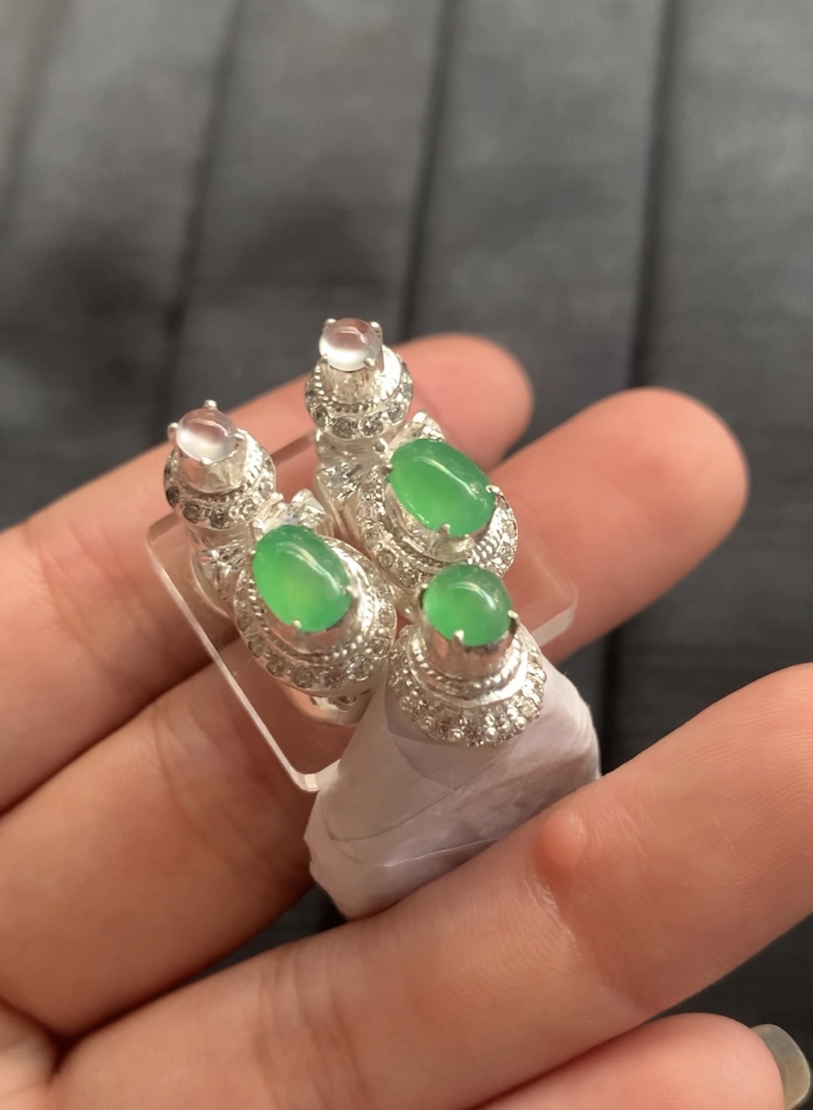 These exquisite earrings feature a unique and intricate design, combining oval cabochons of vibrant green jadeite with clear, icy white stones. Each piece is set in a detailed silver-toned mounting adorned with a halo of small sparkling gemstones, creating an ornate, vintage-inspired look. The rich green hue of the jadeite contrasts beautifully with the cool clarity of the white stones, offering a perfect blend of natural beauty and classic elegance. Ideal for adding a touch of sophistication and unique style to any ensemble.